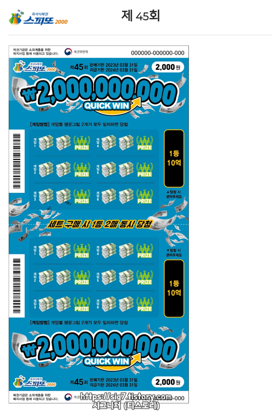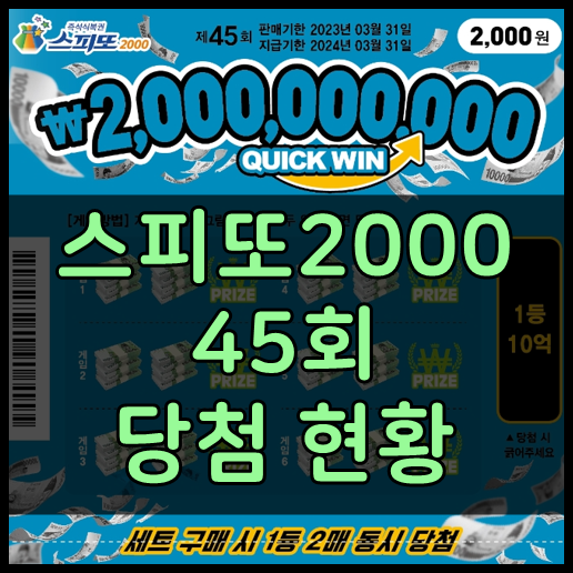 스피또2000 45회차는 판매가 시작된 지 아직 2달도 채 안 돼서 그런지 1등 10억 당첨자는 나오지 않은 상태네요.
