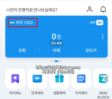 로그인 후, 메인 화면에 보이는 '우리은행 계좌'를 눌러줍니다.