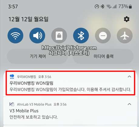 그러면 이렇게 "우리WON뱅킹 WON알림 가입 안내" 알림을 받게 됩니다. 이러한 알림을 받았다면 입출금 알림 서비스 가입은 완료된 것입니다.