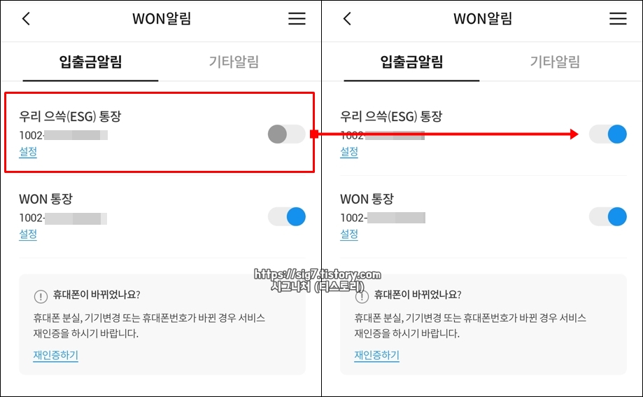 입출금 알림 탭에서 알림이 필요한 계좌를 (알림) ON 상태로 변경해줍니다. (우측 사진처럼)