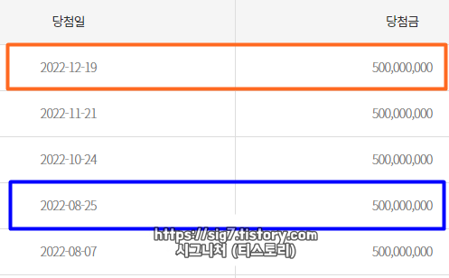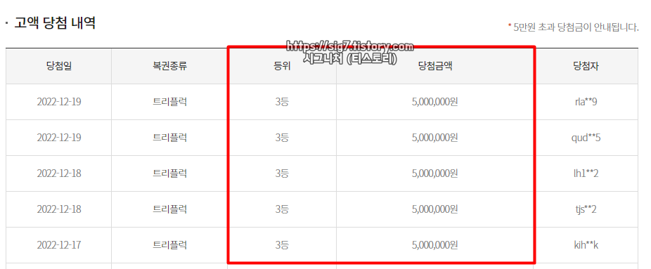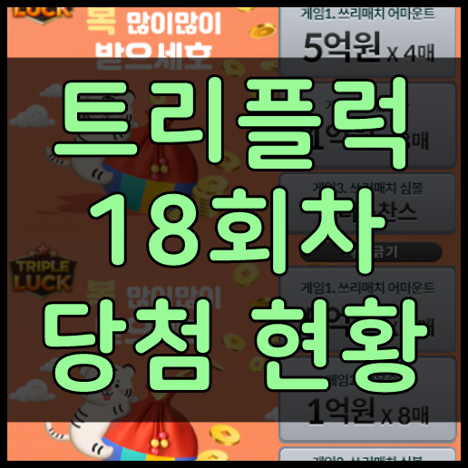 참고로 트리플럭 18회차 1등 5억 당첨자는 22년 08월 25일에 처음 나왔으며, 이후 1달 간격으로 1등 당첨자가 나왔다.