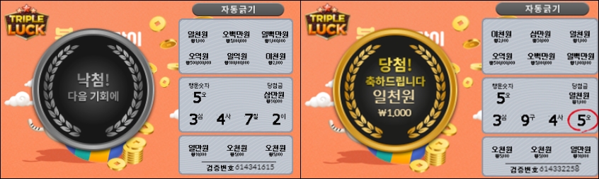 동행복권에서 합법적으로 판매되고 있는 온라인 즉석복권 "트리플럭". 해당 복권은 1장당 1천원이며, 1등 당첨금은 5억원이다. (2등 당첨금은 1억)