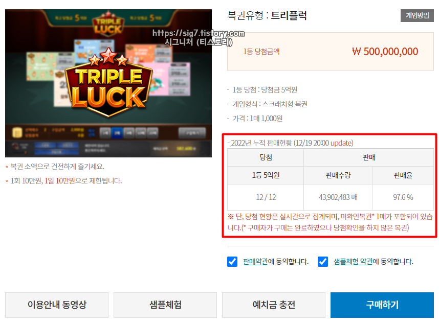 즉석복권의 가장 큰 장점은 구매 직후 바로 당첨 결과를 확인할 수 있다는 것인데. 트리플럭은 인터넷으로도 구매가 가능한 상품이라 나름 많은 인기를 누리고 있는 복권이다. 그리고 또 판매처가 동행복권 한 곳이니 모두가 동등한 확률 게임을 할 수 있다는 것도 장점이라면 장점이다.