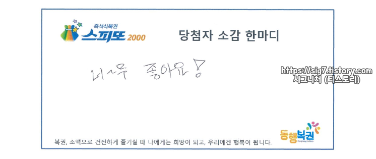 1등 20억 당첨자가 남긴 당첨자 소감입니다. 간단 명로하네요. "너~무 좋아요!"라고 남기셨어요. 한 문장 뿐인 당첨 소감인데 이 글을 쓸 때 얼마나 기쁜 마음으로 작성하셨는지 조금은 상상이 가는 글귀네요.