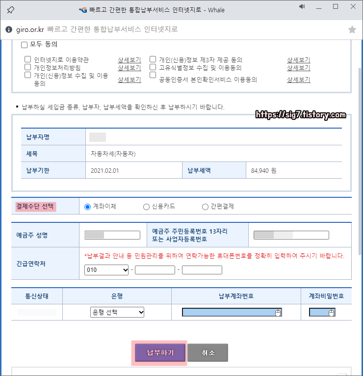 약관에 동의한 후, 결제 수단(계좌이체, 신용카드, 간편 결제)을 선택해줍니다. 그리고 결제 정보를 입력한 후, 납부하기 버튼을 눌러줍니다.