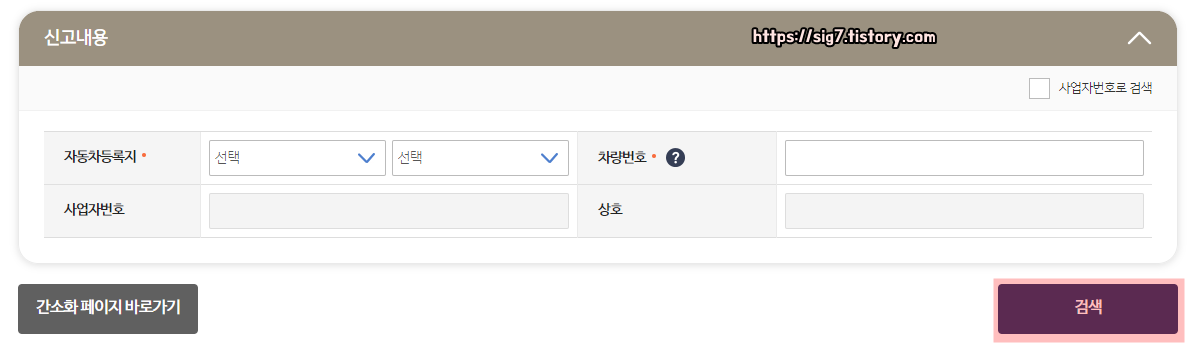 이어서 신고내용(자동차등록지, 차량번호)를 입력한 후, 검색 버튼을 눌러줍니다.