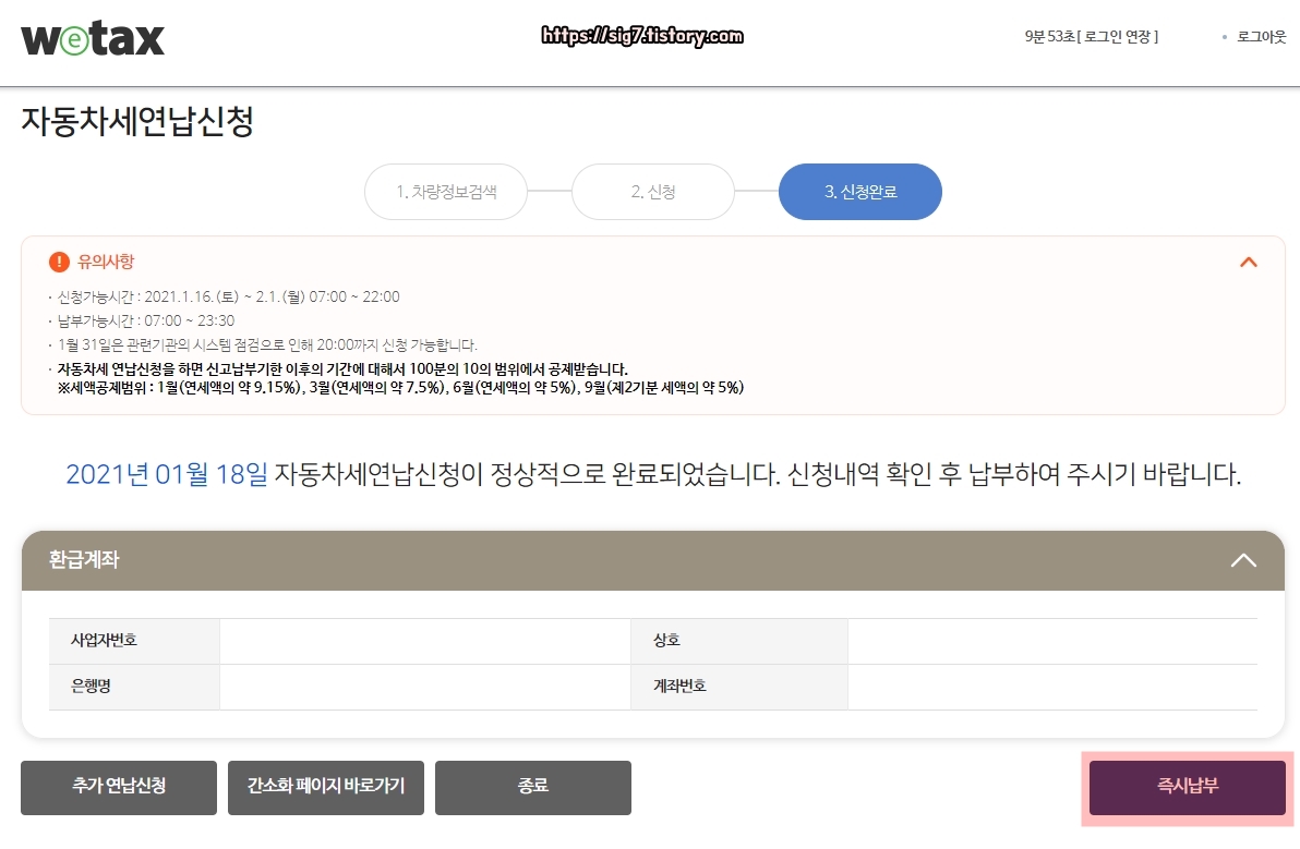 그러면 자동차세 연납 신청이 완료됩니다. 이제 할인받은 자동차세를 납부해줘야겠죠. 우측 하단에 보이는 즉시 납부 버튼을 눌러줍니다.