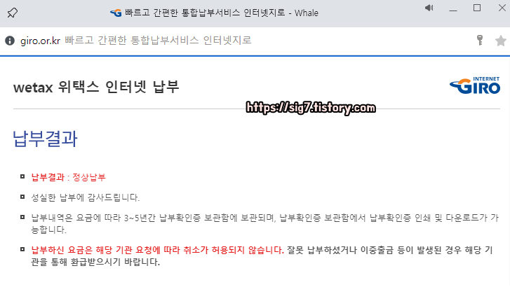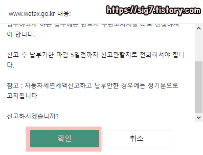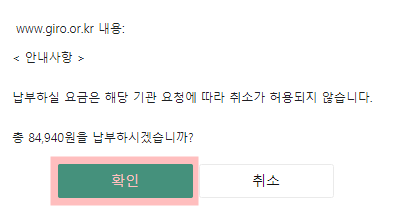 위와 같이 납부 확인 창이 뜨면 확인 버튼을 눌러줍니다.