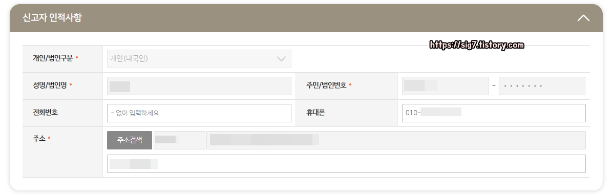 신고자 인적사항(성명, 주민번호, 휴대폰번호, 주소)을 모두 입력해줍니다.