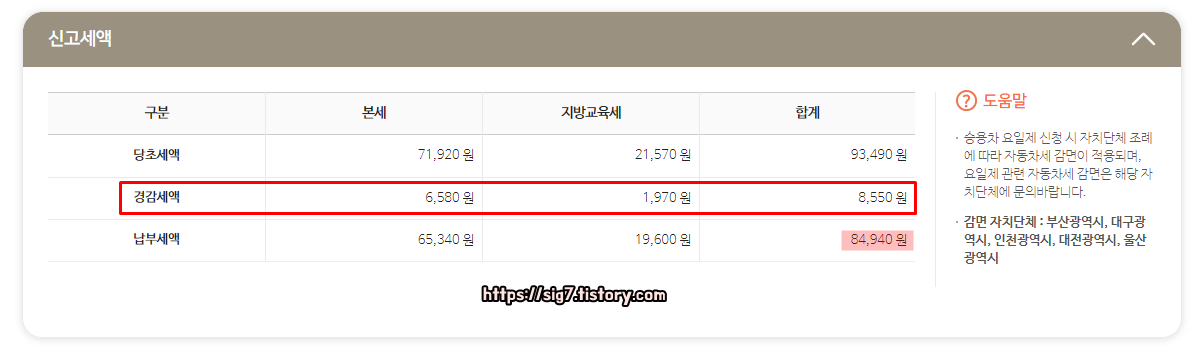 그러면 이렇게 당초세액, 경감세액, 납부세액을 확인할 수 있을 것입니다. 제가 할인받은 금액은 8,550원이군요.