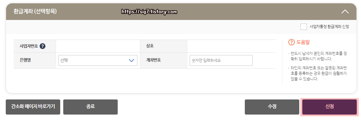 환급계좌(선택항목)까지 입력한 후, 신청 버튼을 눌러줍니다. 참고로 저는 환급계좌를 입력하지 않았습니다. 환급받을 일이 없을 것 같아서..