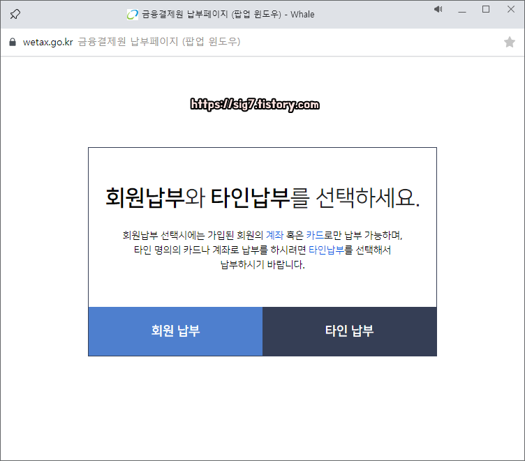 회원납부(본인 명의 계좌 또는 카드) 또는 타인 납부(타인 명의 계좌 또는 카드)를 눌러줍니다.