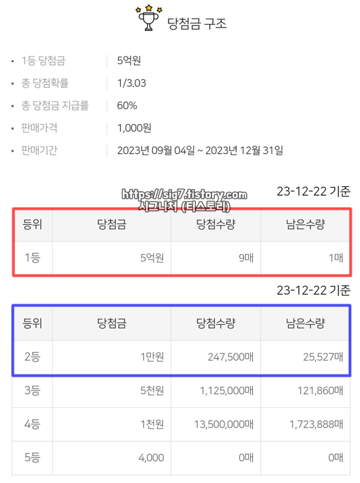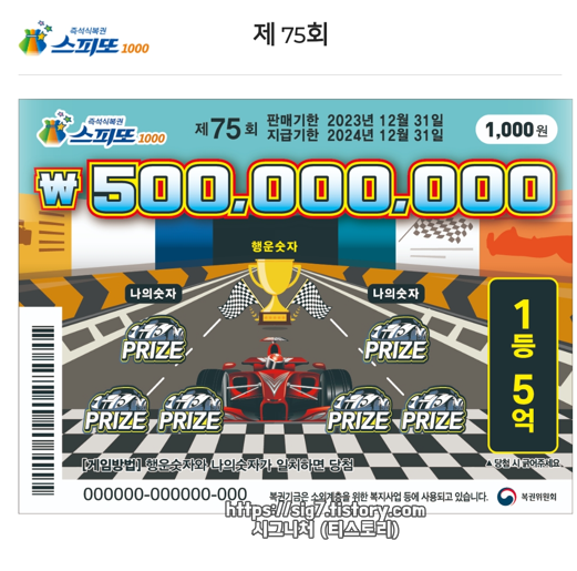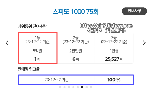 스피또1000 75회 남은 당첨 복권 수량은 23년 12월 22일 금요일 기준으로 1등 5억원 1매, 2등 2천만원 6매입니다.