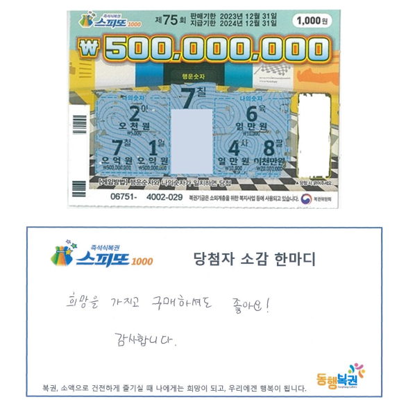 이것은 제일 최근에 나온 스피또1000 75회차 1등 5억 당첨금을 수령한 사람의 소감입니다. 당첨금 수령일은 23년 11월 30일 목요일이며, 해당 복권은 칠성슈퍼(경기 안산시 단원구 선부광장1로)에서 나왔습니다. 당첨자가 말하기를 1등 5억 당첨금은 대출금 상환 및 이사에 쓸 예정이라고 하네요. 추가적으로 당첨자는 평소에도 로또, 연금복권, 스피또를 구매하는 사람이었다고 합니다.