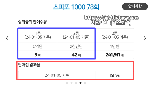 스피또1000 78회 당첨 복권 잔여 수량은 2024년 01월 05일 금요일 기준으로 1등 5억 9매, 2등 2천만원 42매입니다. 그리고 전국 판매점에 입고된 비율은 19%네요.