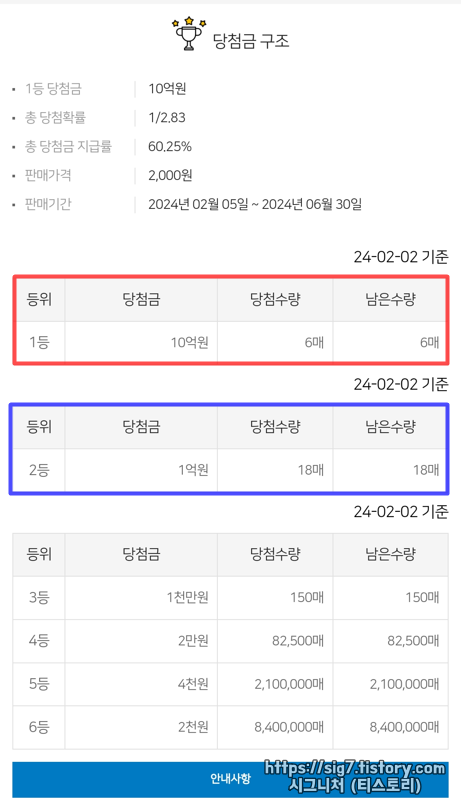 | 등위 | 당첨금 | 남은 수량 | 당첨 확률 |