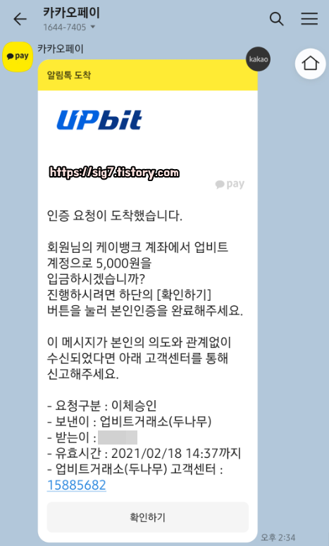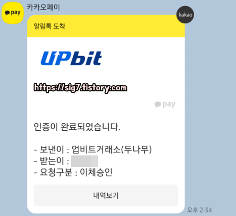모바일 카카오톡으로 가면 이렇게 업비트 알림톡이 와있을 텐데요. 여기서 아래에 보이는 '확인하기'를 눌러 카카오페이 인증(비밀번호 입력 필요)을 진행해줍니다.