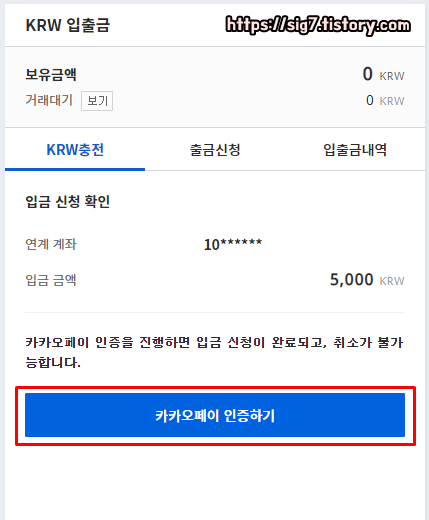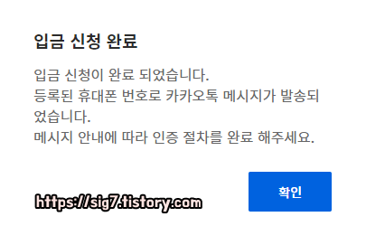그러면 이렇게 입금 신청이 완료됩니다. 이제 마지막으로 카카오페이 인증만 해주면 원화 충전이 완료될 것입니다.