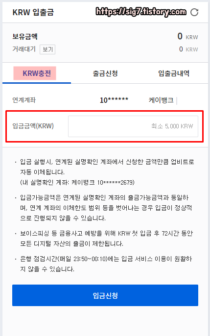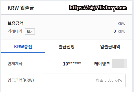 KRW(원화) 충전 탭으로 이동한 후, 입금 금액을 입력해줍니다. 입금 금액은 최소 5,000원 이상으로 입력해야 합니다.