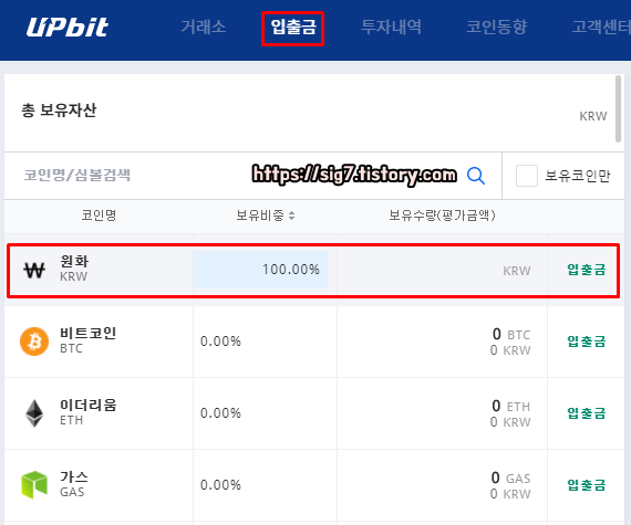 업비트 홈페이지 접속 후, 입출금 메뉴로 이동해줍니다. 그리고 '원화'를 눌러줍니다.