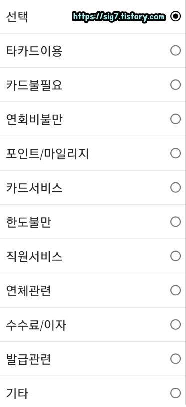 참고로 선택 가능한 카드 해지 사유는 타 카드 이용, 카드 불필요, 연회비 불만 등이 있습니다. (위 사진 참고)