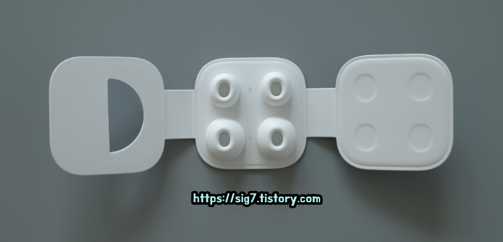 여분 이어팁은 S, L 사이즈가 있습니다. M 사이즈 이어팁은 에어팟 프로에 기본적으로 장착되어 나오기 때문에 여기엔 없네요.