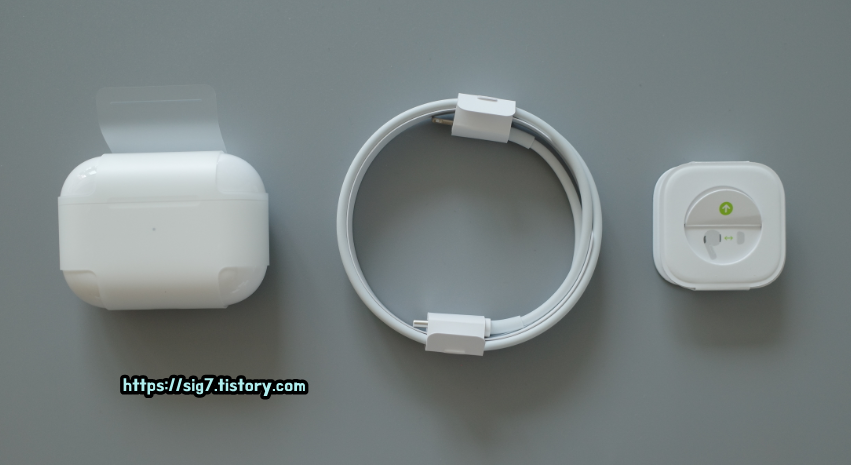 에어팟 프로 구성품은 기기 본품, C to 8핀 케이블 (고속 충전 지원), 이어팁(S, M, L 사이즈)입니다.