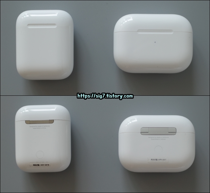 좌측이 에어팟 2세대고, 우측이 에어팟 프로인데요. 일단 눈에 보이는 차이는 케이스 크기와 LED 표시등 위치네요.
