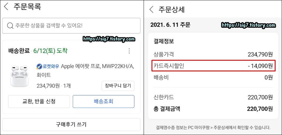 저같은 경우에는 에어팟 프로를 쿠팡에서 220,700원 주고 구매를 했습니다. 상품 가격 기본 할인에다가 특정 카드사 할인까지 받아서 상시 판매 가격보다 더욱 저렴히 구매할 수 있었죠. (때마침 카드사 할인을 해서 평소보다 저렴하게 구매할 수 있었던..)