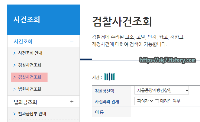 그리고 좌측 메뉴에 보이는 '검찰사건조회'를 눌러줍니다.