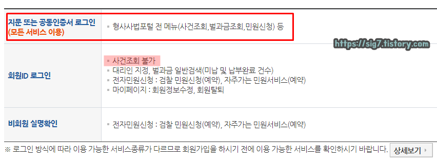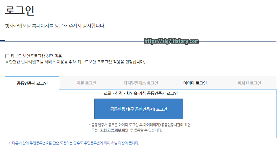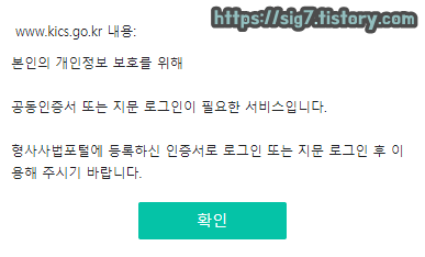 검찰 사건을 조회하기 위해선 공동인증서 로그인이나 지문 로그인이 꼭 필요하군요. 팝업창에 보이는 확인 버튼을 눌러 로그인 화면으로 이동해줍니다.