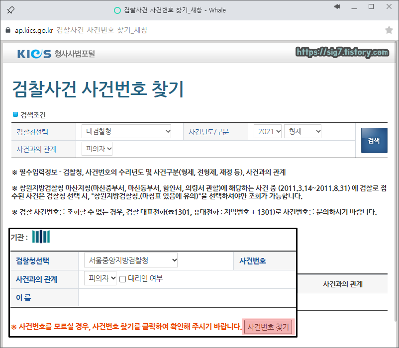 그런데 만약 검찰 사건 사건 번호를 모르신다면, 검찰 사건 조회 화면에 보이는 '사건번호 찾기'를 눌러 사건 번호를 찾아주면 됩니다. 사건 번호 찾기에 필요한 정보는 검찰청, 사건년도, 구분(형제, 불항 등), 사건과의 관계(피의자, 고소인, 고발인, 피해자)입니다.