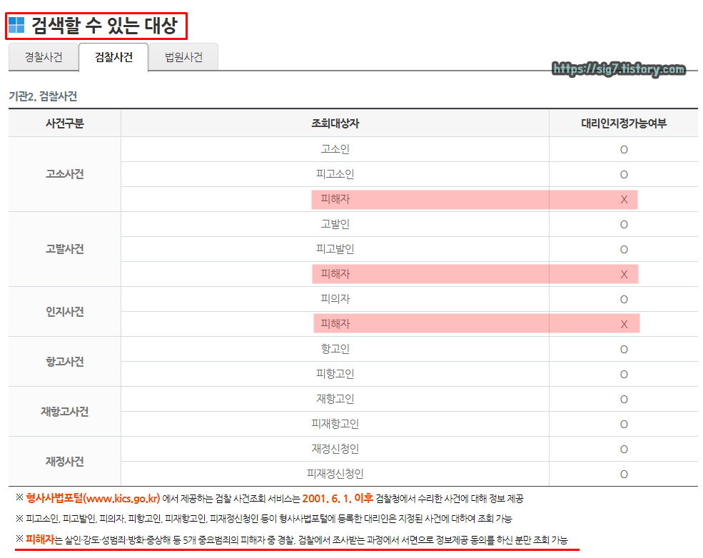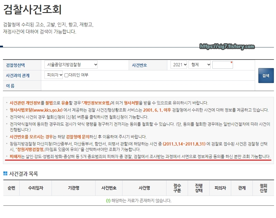 참고로 피해자는 살인, 강도, 성범죄, 방화, 중상해 등 5개 중요 범죄의 피해자 중 경찰, 검찰에서 조사받는 과정에서 서면으로 정보제공 동의를 한 사람만 인터넷으로 검찰 사건 조회가 가능합니다.