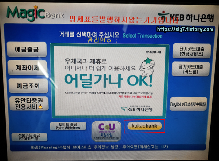 ATM 화면 하단에 보이는 'kakao bank'를 터치해줍니다.