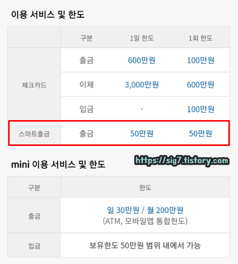 그리고 카카오뱅크 스마트출금 이용 한도는 1일 50만원, 1회 50만원입니다.