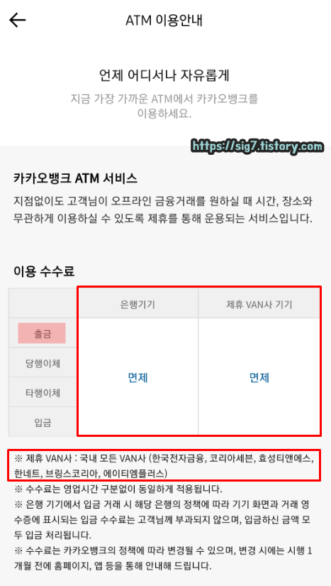 다들 아시다시피 카카오뱅크 출금 수수료는 은행이나 제휴 VAN사 기기(코리아세븐, 효성티앤에스, 한네트 등) 모두 무료입니다. 이 출금 수수료는 카카오뱅크 타행카드 출금과 스마트출금 모두 동일하게 적용되기 때문에. 카카오뱅크 스마트 출금 수수료 또한 무료라고 생각하면 됩니다.