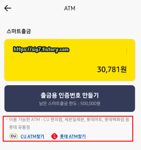 카카오뱅크 스마트출금 이용 가능 ATM 기기는 CU 편의점, 세븐일레븐, 롯데마트, 롯데백화점 등입니다.