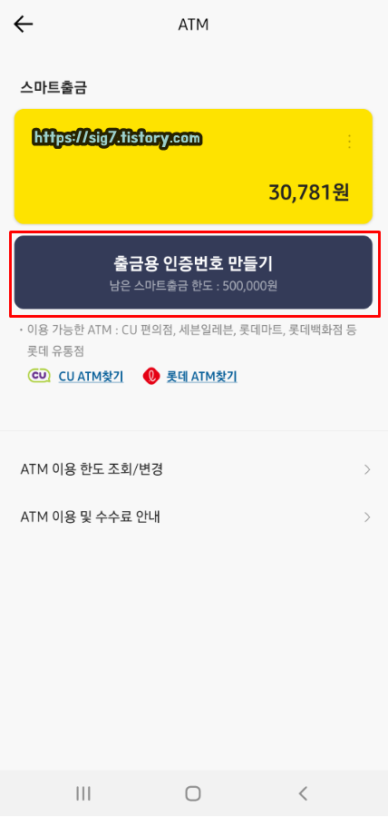 그러면 이렇게 5분 동안 사용할 수 있는 출금용 인증번호가 만들어집니다. 그럼 이제 CU, 세븐일레븐, 롯데마트, 롯데백화점 ATM기 앞으로 가줍니다.