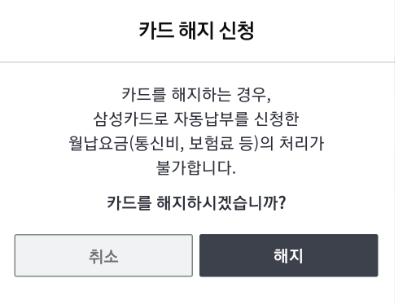 위와 같이 해지 카드 선택 확인 창이 뜨면 확인 버튼을 눌러줍니다.
