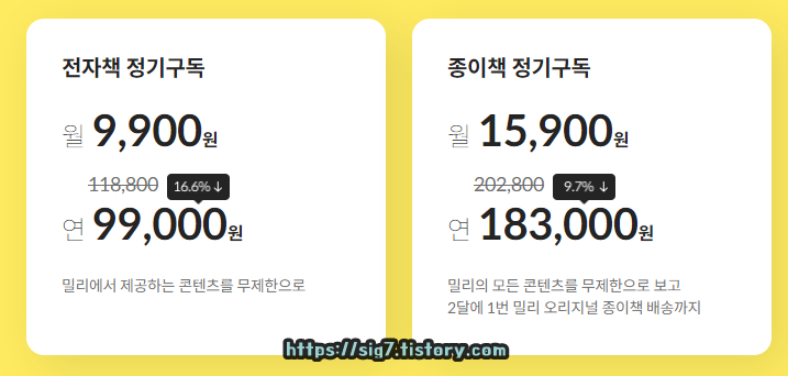 밀리의 서재 이용권 가격은 전자책 기준 월 9,900원이고, 연 99,000원(16.6% 할인)입니다. 그리고 전자책에 종이책까지 함께 구독하면 월 15,900원, 연 183,000원(9.7% 할인)입니다.