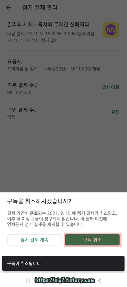 마지막으로 '구독 취소'를 눌러주면, "구독이 취소됩니다."라는 문구가 뜨면서 구독 취소(자동결제 해지)가 완료됩니다.