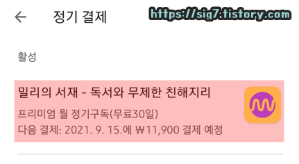 그러면 이렇게 구글플레이스토어 정기 결제 메뉴로 이동되는데요. 여기서 '밀리의 서재'를 눌러줍니다.