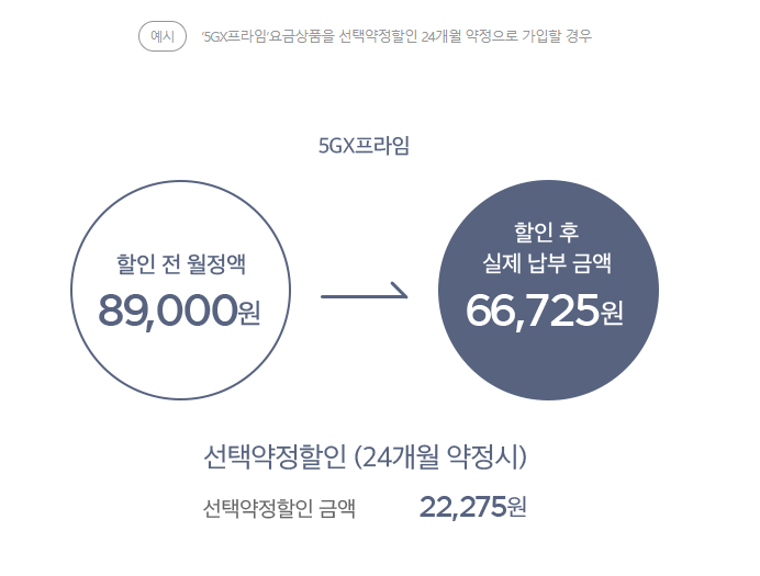 만약 본인이 이용 중인 요금제가 5GX프라임 요금제라면 선택 약정 시 22,275원을 할인받을 수 있습니다. 생각보다 할인 많이 되죠?