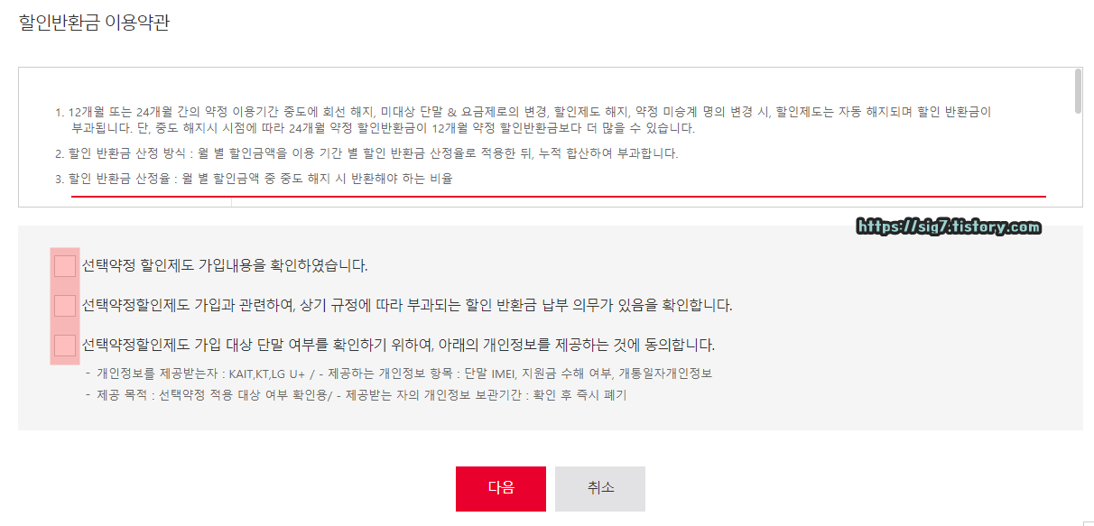 할인반환금 이용약관(위약금)까지 모두 확인한 후, 다음으로 넘어가 줍니다.