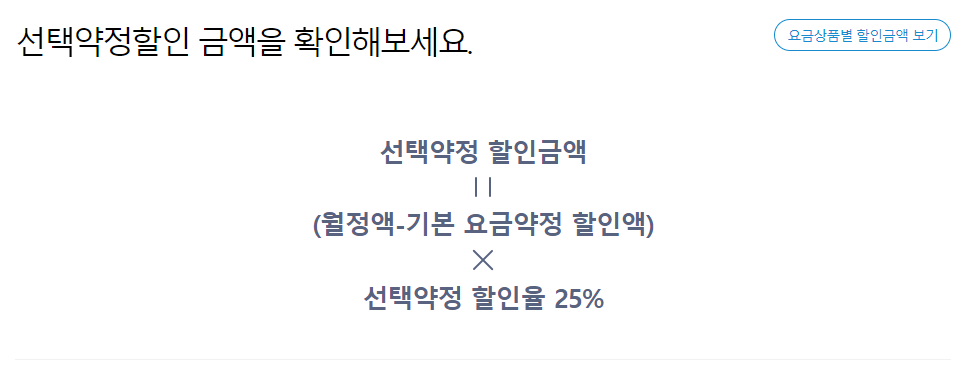 선택 약정 가입 시 할인받게 되는 정확한 금액은 "(월정액 - 기본 요금약정 할인액) X 25%"입니다.