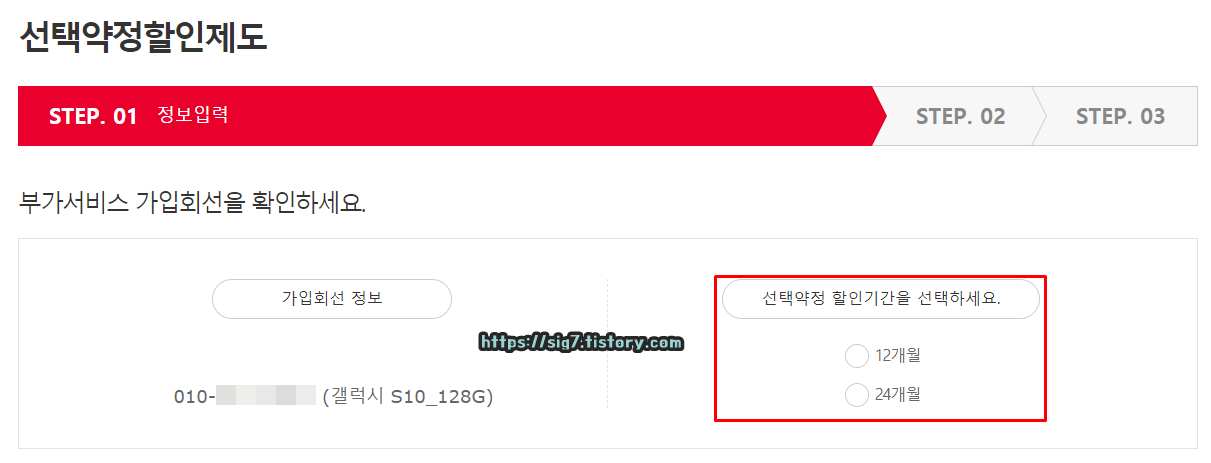 가입 회선 정보를 확인한 후, 선택 약정 할인 기간(12개월, 24개월)을 선택해줍니다. 참고로 12개월이나 24개월이나 할인 금액은 본인 요금제 가격의 25%로 똑같기 때문에 웬만하면 12개월로 추천드립니다. (나중에 해지할 일이 생기면 위약금 때문에 곤란해질지도 몰라요.)
