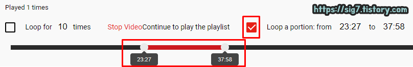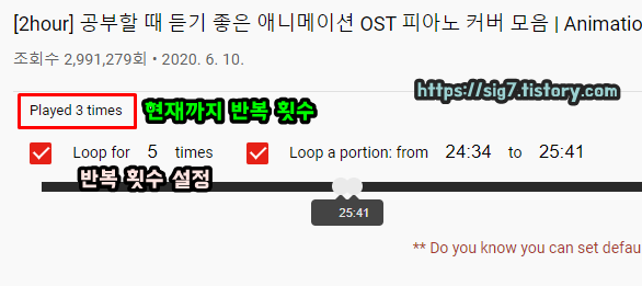그리고 좌측에 보이는 'Loop for 5(수정 가능) time'은 횟수 반복입니다. 위 설정대로라면 해당 영상을 5번까지만 반복 재생한다는 뜻이죠. 참고로 그위에 보이는 'Played 3 times'는 현재까지 총 3회가 반복 재생됐다는 뜻입니다.