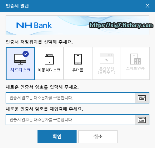 인증서 저장 위치를 선택한 후, 앞으로 범용인증서 암호를 설정해줍니다. 참고로 인증서 암호는 대소문자를 구분합니다.