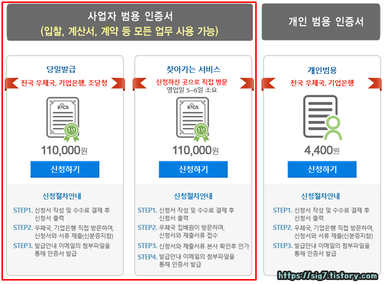 그리고 또 둘 사이에 큰 차이점은 '발급 비용'입니다. 공동 인증서는 발급 비용이 무료이지만 개인용 범용인증서는 발급 비용이 4,400원이라는 것입니다.