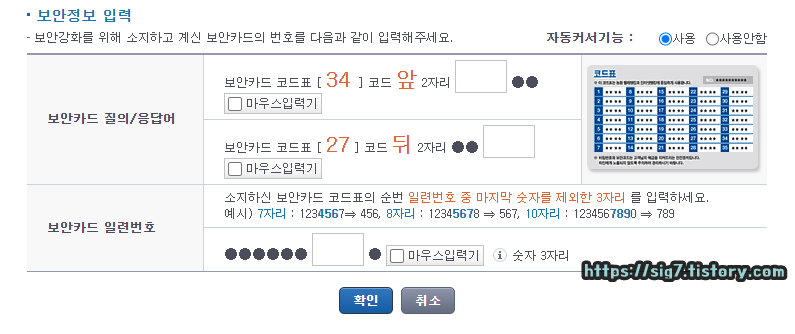 마지막으로 보안 정보 입력을 해줍니다. 저는 보안카드 이용자라서 보안카드 정보를 입력했네요.